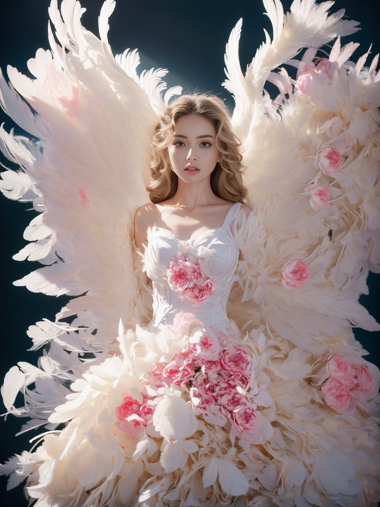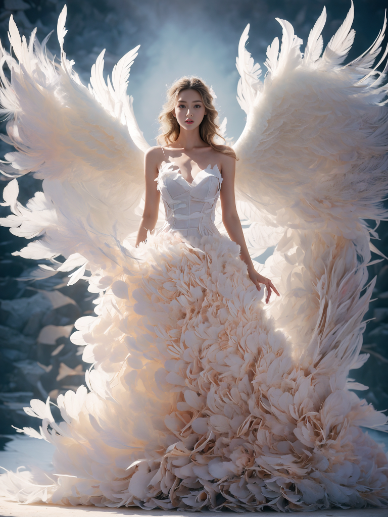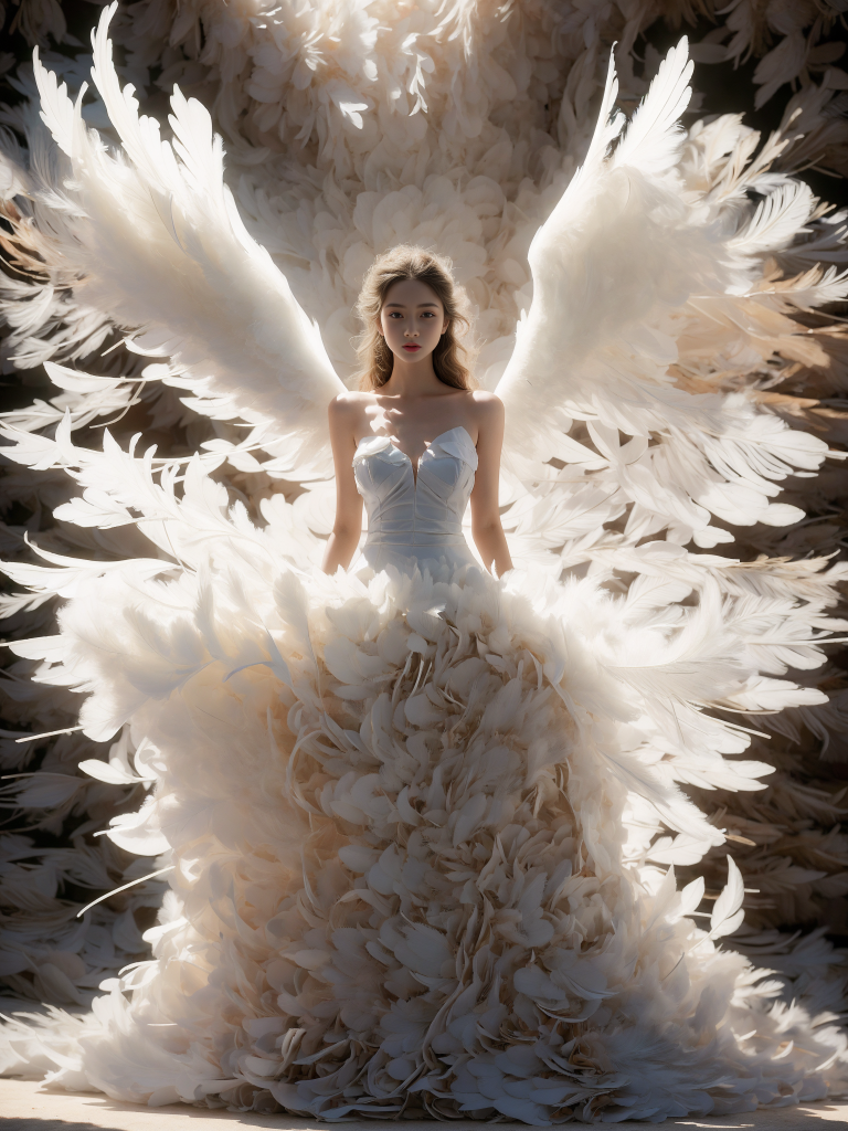 梦幻天使羽毛婚纱礼服写真:翅膀与裙摆的光影艺术摄影素材